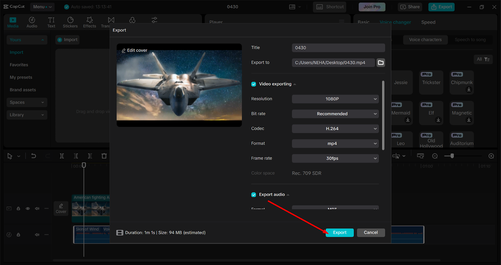 Once you are happy with everything, click on “Export” at the top right of the screen. Select your video quality settings and save the finished video to your computer. Now your short flight sim video has a fun new voice effect!