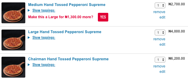 Even though the ‘Chairman’ might truly be 30% bigger than the large size that extra 2,200 naira you have to pay for it isn’t worth it. It also turns out your best bet when buying a pizza at Dominos is the medium size. However, they have a turn of deals and promotions currently running to push ‘Chairman’ now, you guys might want to get in there.