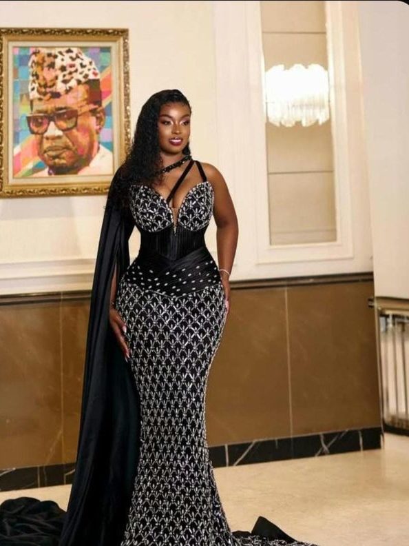 This gown is art. With clean lines, bold contrast, and a high neckline, it brings a modern architectural feel to formalwear. The black-and-white palette keeps it classic, but the sculptural silhouette makes it anything but ordinary.