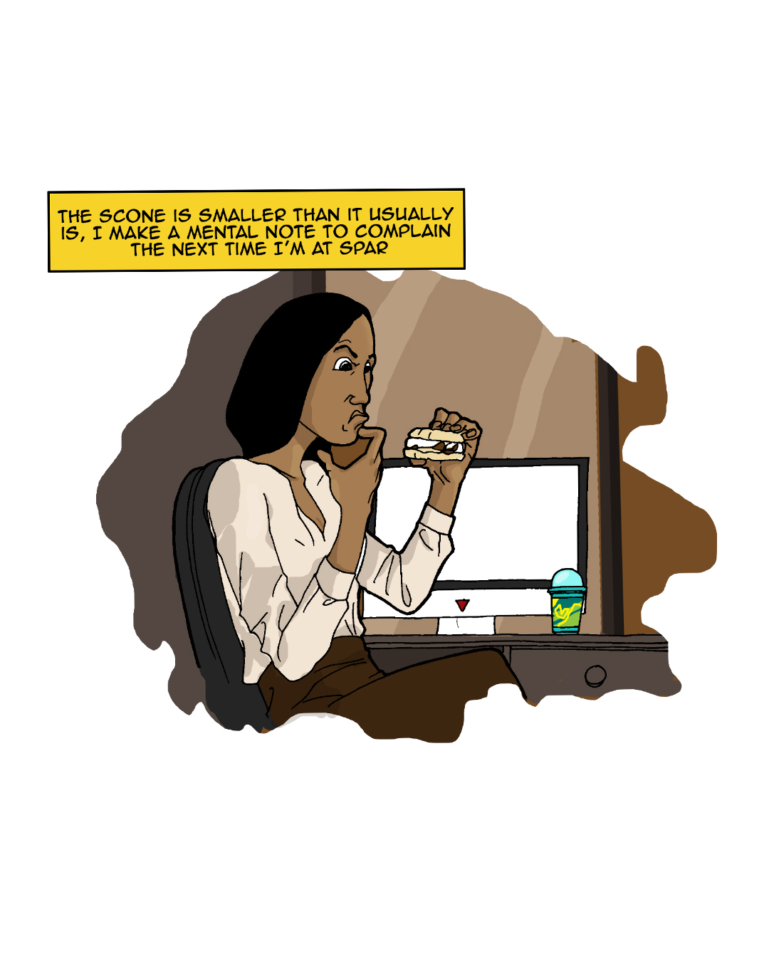 10:15 a.m. – I eat my scone and yoghurt cup. The scone is smaller than it usually is, I make a mental note to complain the next time I’m at SPAR.