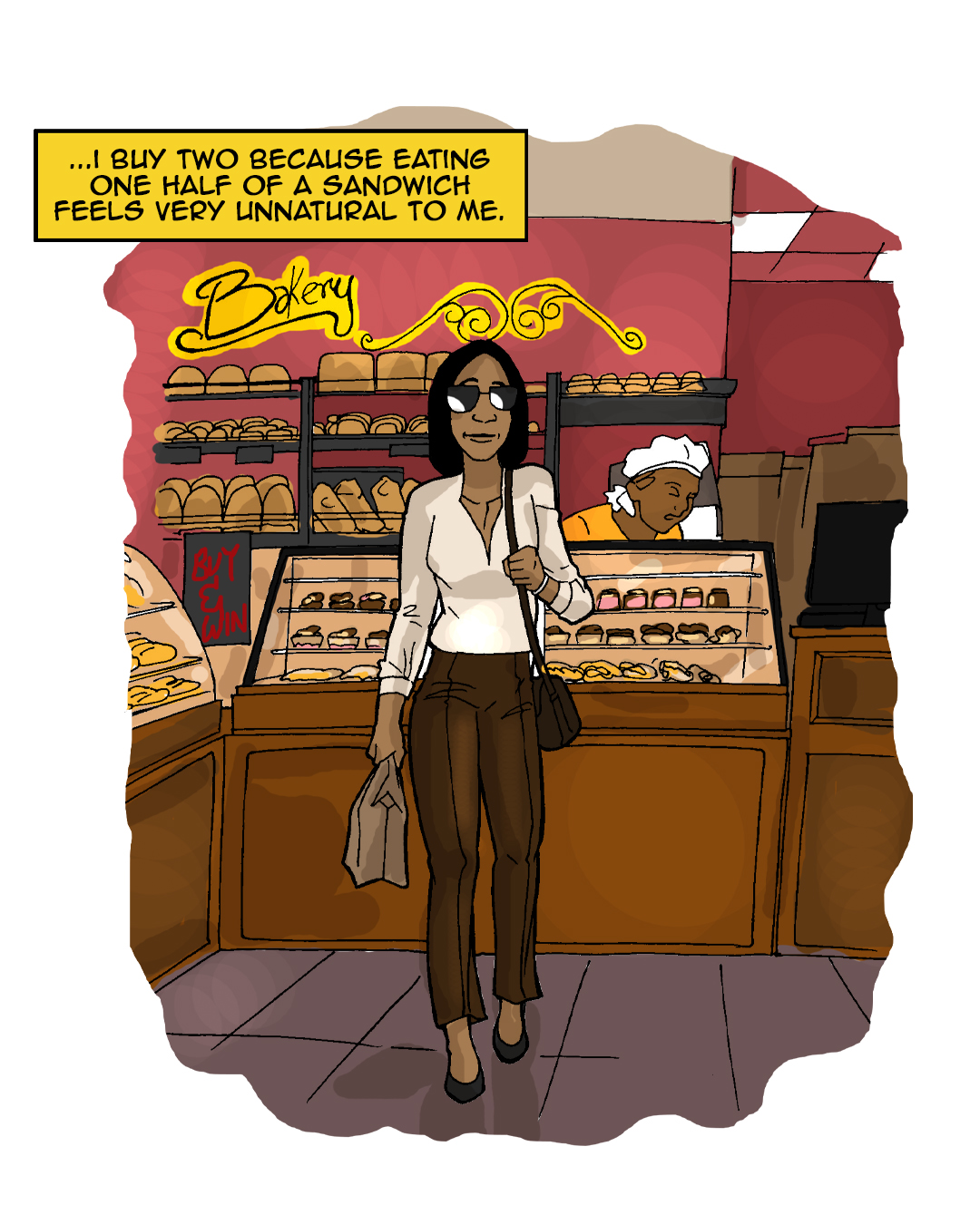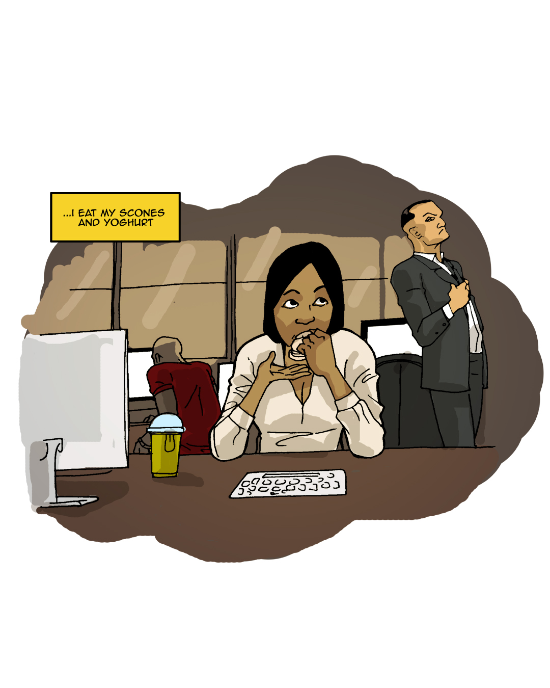 8:45 a.m. – I pack my scone and yoghurt and remember not to stop at my bakery. I’m running late for work anyway.