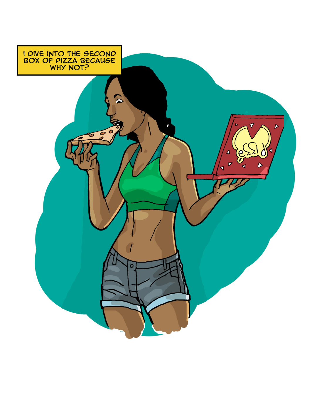 1:00 a.m. – I wake up to drink water. I try to go back to bed but hunger pangs won’t let me be great. I heat up a couple of slices of leftover pizza from my freezer. There’s always leftover pizza in my freezer don’t ask me why.