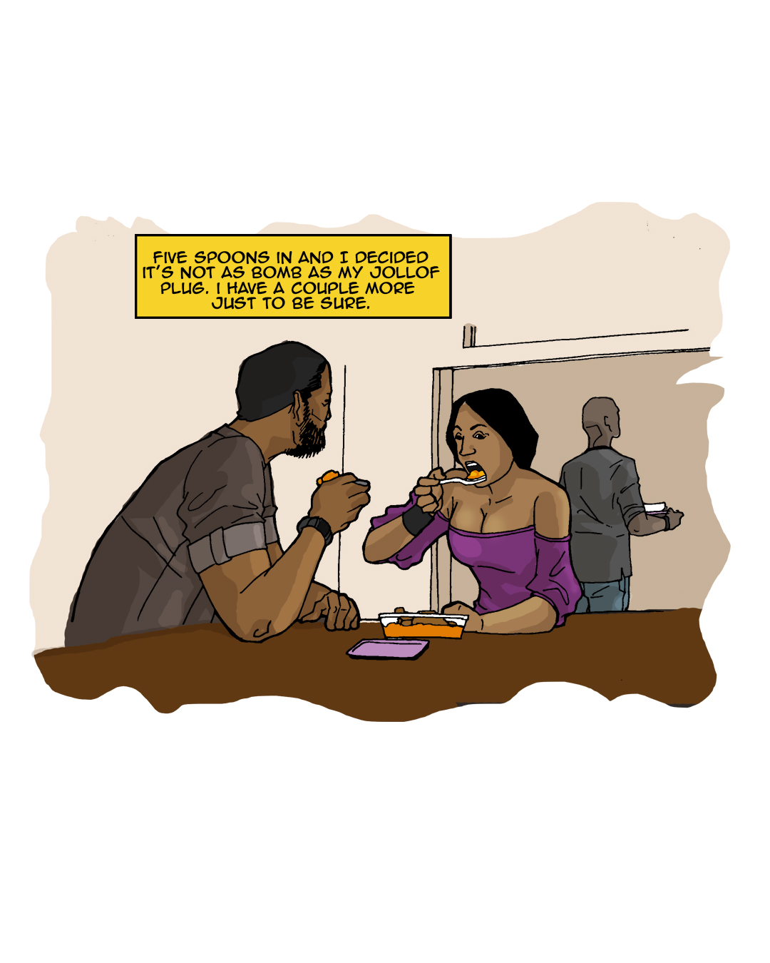 10:45 a.m. – Fu’ad says he has Jollof rice from this place he has been raving about so I follow him to the kitchen with a spoon just to ‘taste’. Five spoons in and I decide it’s not as bomb as my Jollof plug. I have a couple more just to be sure.