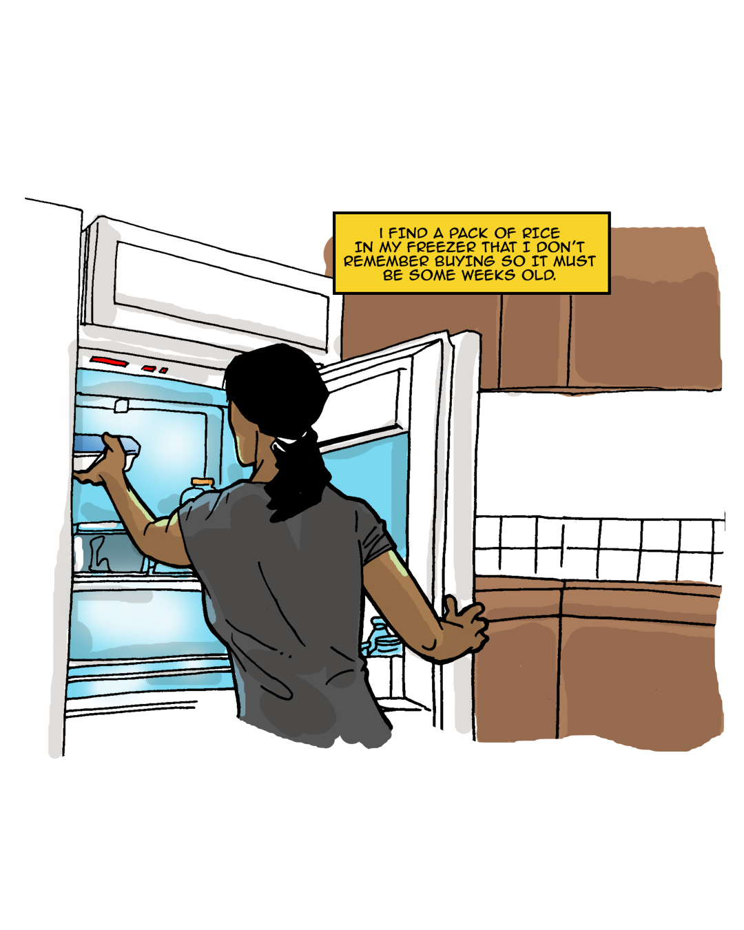 2:15 a.m. – I don’t know why I’m awake or why I always find myself awake at hours where my body feels the need to eat unreasonably. I find a pack of rice in my freezer that I don’t remember buying so it must be some weeks old. I heat it up and eat, ignoring the stale smell.