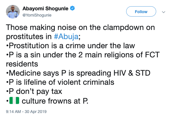 Again prostitution is only criminalised in the Northern states of Nigeria and Abuja, not the whole country.