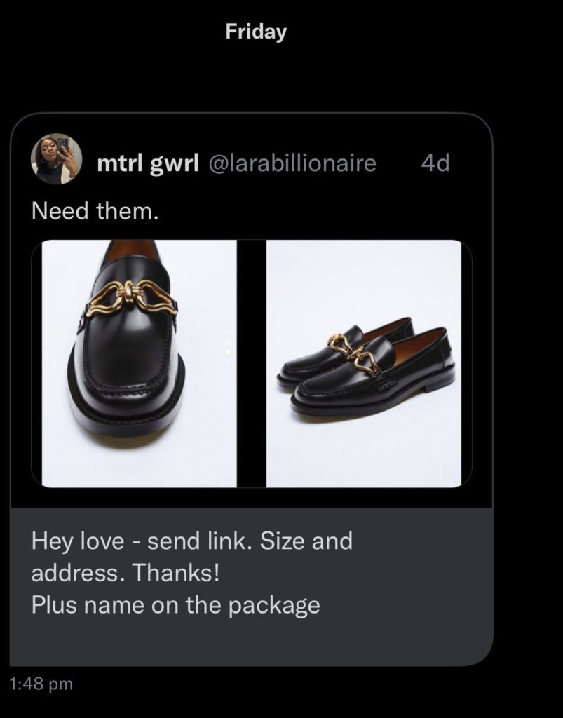 You cannot be a material gworl without money. If not, how will you sponsor your lifestyle or all the things you’d like to get for yourself? You have to have money. I truly believe that the best type of material gworl is a sponsored one. As the first child, grandchild, and great-grandchild, I enjoyed a lot of things. Everything came from a place of love, so it was easy to know that everything I desire, I go receive.Now that I’m older, I hate that I have to work to maintain the lifestyle they introduced me to, but once a material gworl, always a material gworl.