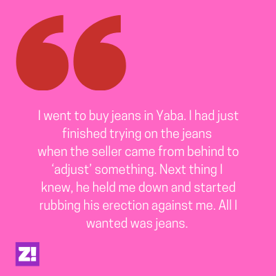 I went to buy jeans in Yaba. I had just finished trying on the jeans when the seller came from behind to ‘adjust’ something. Next thing I knew, he held me down and started rubbing his erection against me. It became a struggle but I was so scared because he was a lot stronger than me and it was a corner shop — it could get violent. He eventually let me go, but I remember just breaking down in tears when I got home. All I wanted was to buy jeans.