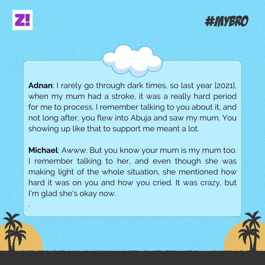 Adnan: I rarely go through dark times, so last year [2021], when my mum had a stroke, it was a really hard period for me to process. I remember talking to you about it, and not long after, you flew into Abuja and saw my mum. You showing up like that to support me meant a lot.