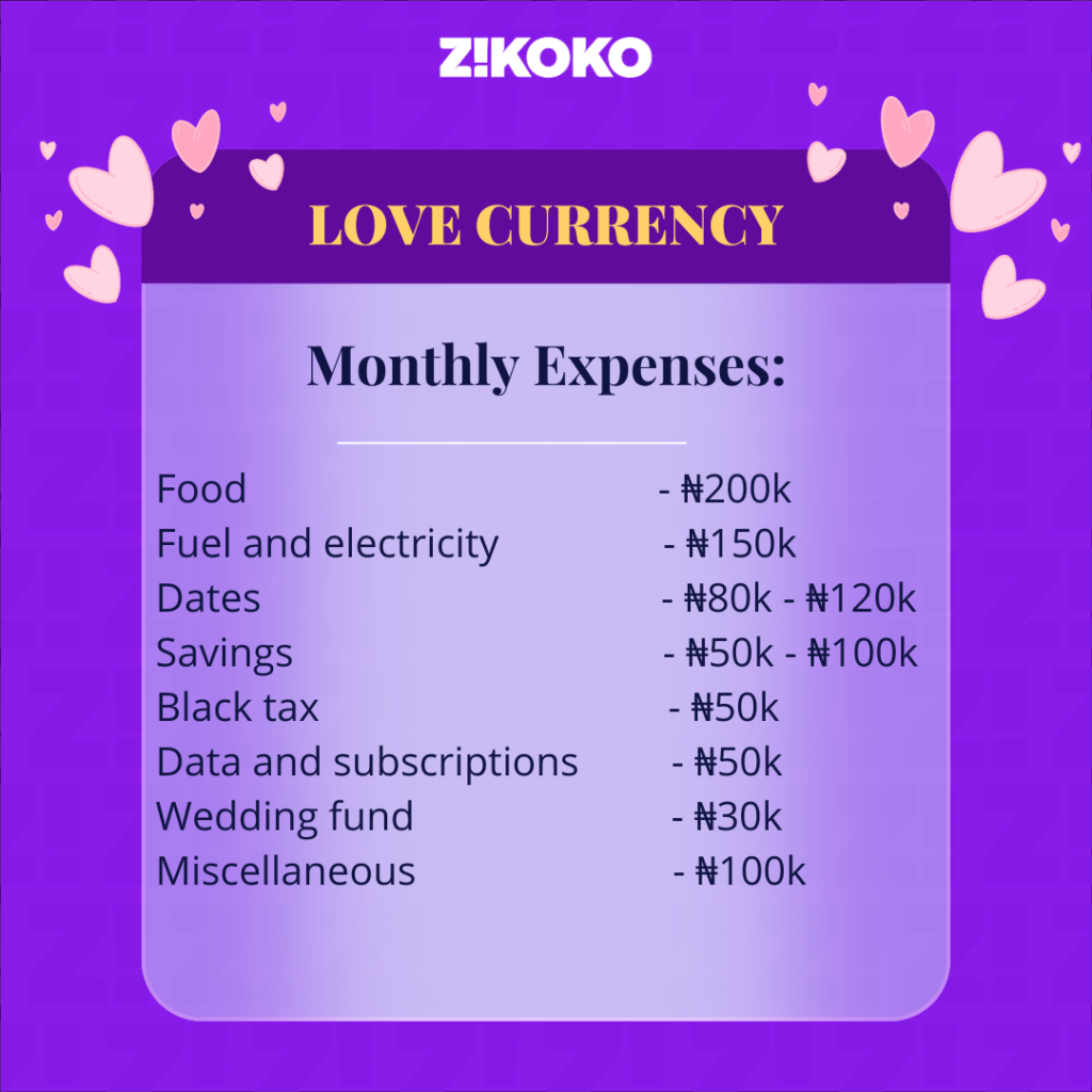 There’s no strict budget to it. Whenever we can, we like to go on dates and visit new recreation spots in Lagos. I typically budget ₦80k – ₦120k for those dates. Sometimes, it’s more, but it’s not all the time. Also, it’s typically just once a month.