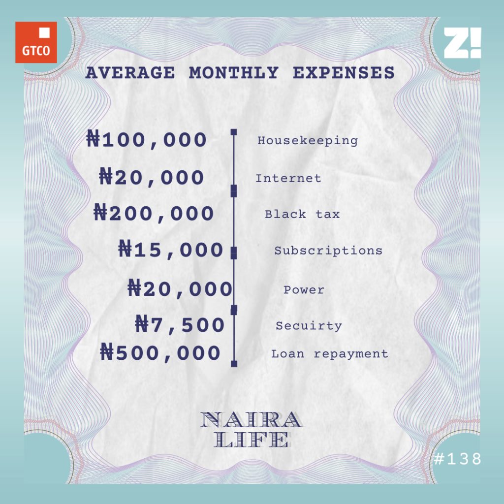 I’m not married, but I have a live-in partner and we have two kids together, hence the housekeeping expenses. I took a loan from work last year to invest in Eurobond, and it’s spread over four years. I’m not mad about it — I’m repaying the loan in naira and earning my ROI in dollars.