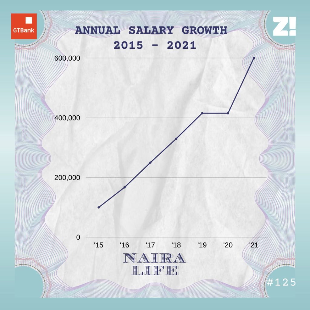 I wanted to do something different from corporate law and I got an offer from a company in financial services to work in their legal department. My salary when I resumed work at the company was ₦220k. Shortly after I joined, the company gave everyone a raise, and I moved to ₦250k. About a year later, I got a promotion and this came with a raise — ₦330k.