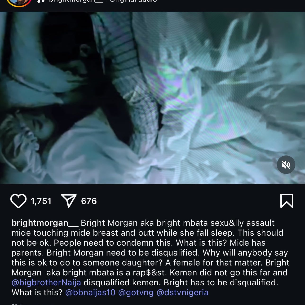 Since Friday, the social media accounts handler of Big Brother Naija 10/10 housemate, Bright Morgan, has been calling for him to be disqualified over claims that he sexually assaulted Mide, a female housemate and his love interest on the show. The account posted a video of Mide and Bright cuddling in bed.