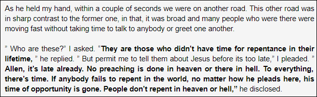“You can’t die now because you still have unfinished business with God. You have a message to pass across. Come and see, why you must go back and spread our message more passionately.”