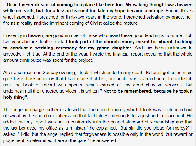 “You can’t die now because you still have unfinished business with God. You have a message to pass across. Come and see, why you must go back and spread our message more passionately.”