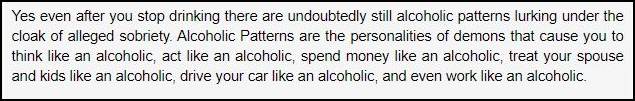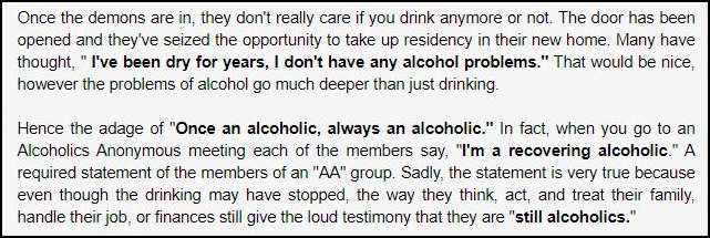 Translation: Because alcohol problems are a result of evil spirits, attempting sobriety without a full-on deliverance session as elaborate as the Broadway production of Phantom Of The Opera will end with the person falling further down the demonic rabbit hole of alcoholism.