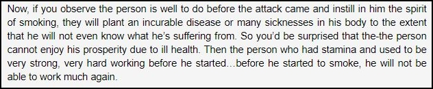 “If you see any person or people smoking cigarettes or marijuana or hemp or cocaine, any kind of thing smokable — usually, it’s not their fault, it is the witches who are the cause of such evil works.“