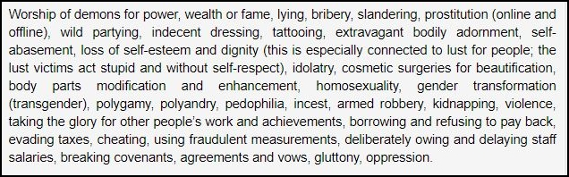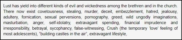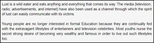 The author goes on to say that God sees everything and won’t let anyone with LUST in their hearts into heaven. He also says that the sin of LUST originated in the garden of Eden when Eve, thanks to the snake, LUSTED after knowledge by eating the fruit. He then goes on define LUST in approximately 2000 words.