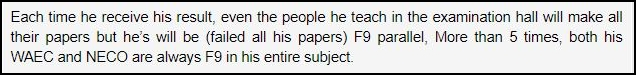 The next year, he registers for his WAEC at a “special centre” and finally passes. That doesn’t stop an F9 parallel result from coming alongside his actual result though.
