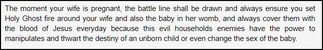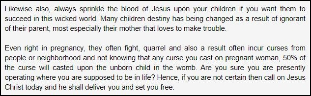 There’s also a paragraph about sprinkling your children with the blood of Jesus if you don’t want their glories destroyed. And it’s like, I get what he’s saying but it also sounds hella creepy because he used the word “sprinkle”, making the instruction sound literal. The chapter ends with classic mother shaming.