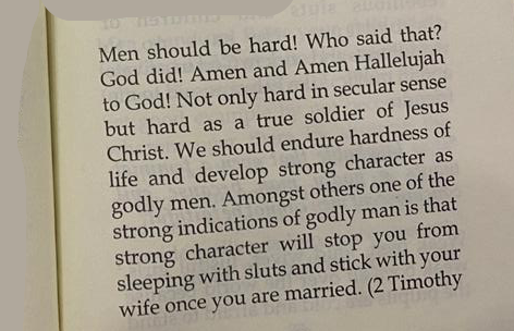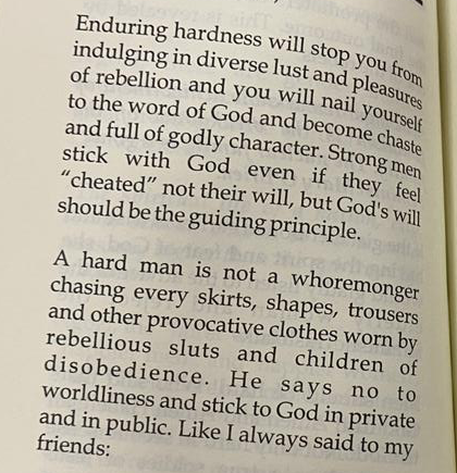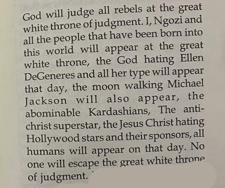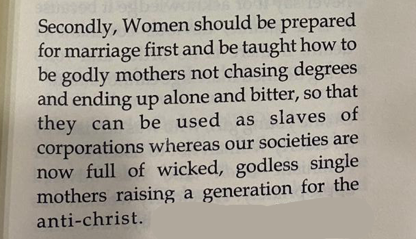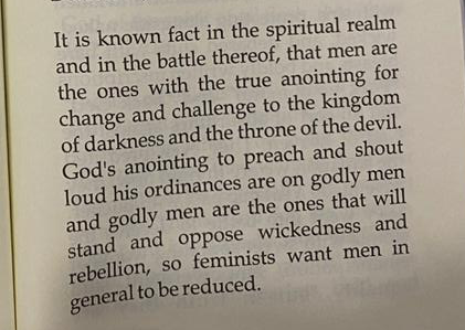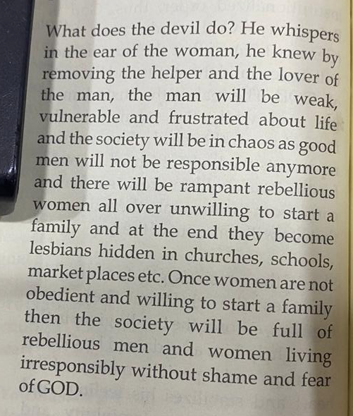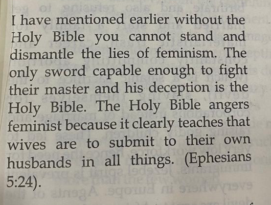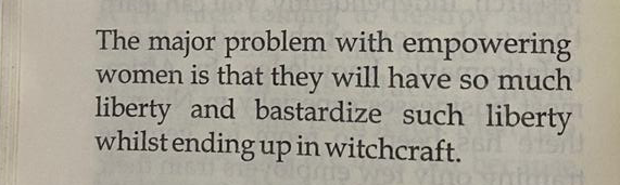 He starts off the book calling CNA ‘Ngozi’ because he clearly has no fucking respect. He says that feminism is breeding a generation of Jezebelic rebels intent on destroying the bedrock of society (family). He also talks about what he believes is the origin of feminism.