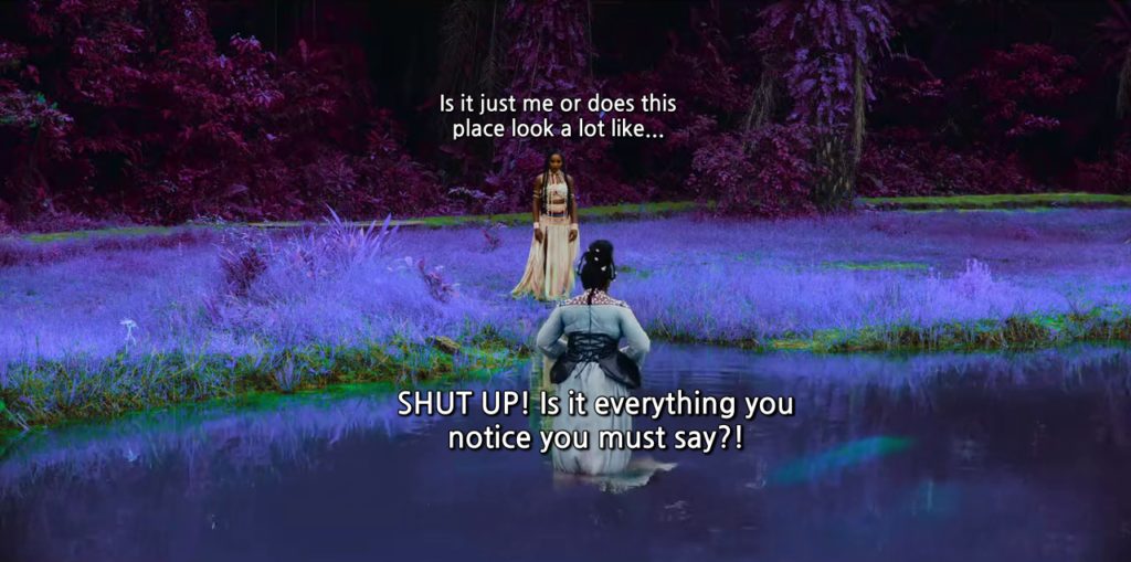 Queen Mother explains that she’s here to help Nneka get revenge against the people who killed her parents. She reveals that Nneka’s mother was a member of Queen Mother’s kingdom and that the people who killed her (the cult that we see pushing a burning coffin into the ocean in the opening scene) also killed Nneka’s parents. Nneka is about that revenge life so she agrees, working with Queen Mother to hunt down the members of the cult. But first, Nneka and Queen Mother link up in a spiritual realm that looks suspiciously like the ancestral plane from Black Panther.