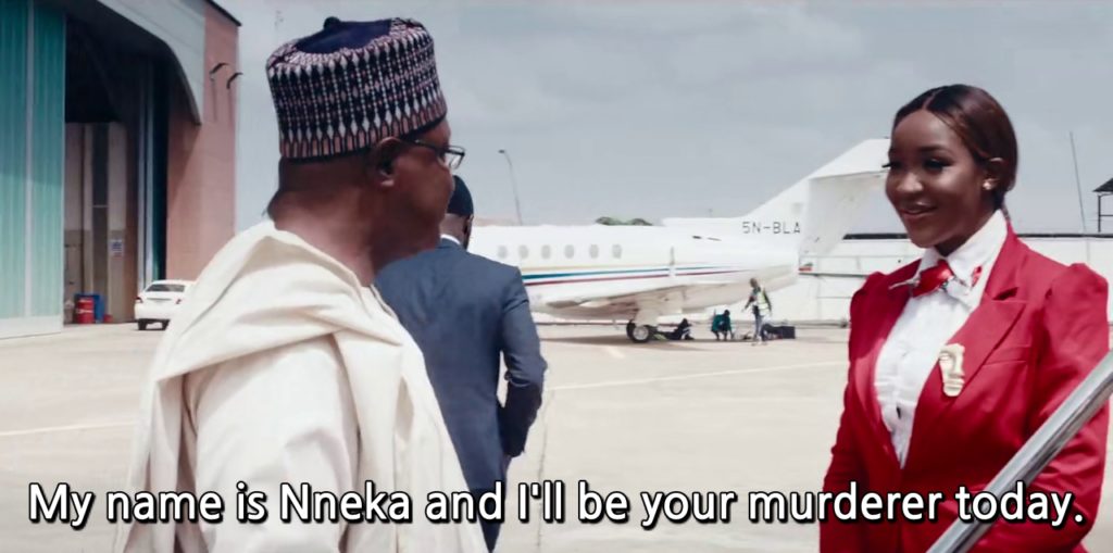 Nneka goes after the fourth member of the Island Collective, a man named Alhaji Abdullahi (Sani Mu’azu). She poses as a flight attendant on his private jet and poisons his champagne.