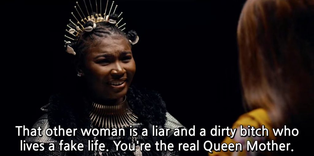 When Nneka gets home, Queen Mother (played by the original Nneka the Pretty Serpent, Ndidi Obi) appears in a mirror and starts talking about how she used to be the queen of a kingdom until she was betrayed, had her powers stolen, killed, and cursed in death. Nneka is understandably freaked out and is like: