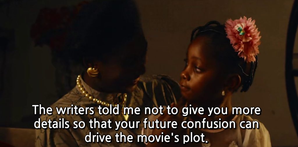 Before Nnneka can even blow out her candles, a group of people that aren’t shown onscreen attack their home. Nneka’s parents seemingly know who the attackers are and help her escape through a back door. But she doesn’t run away immediately and stays back to watch the attackers murder her parents with a sword. As all this is happening, I can’t help but notice how similar this is to the 200 versions of Bruce & Martha Wayne’s death scene that DC has shown us over the years. I’m also super distracted by the child actor’s inability to properly look sad.