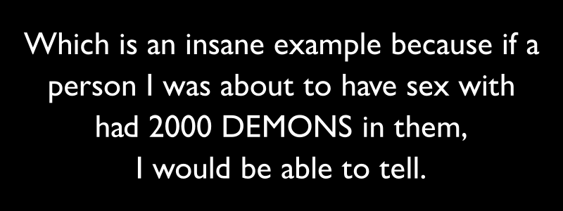 The author takes his time to explain that fornication opens you up to diseases (both physical and spiritual). According to him, fornication leads to demon transfer i.e (and this is his example btw) if a man or woman possesses 2000 demons within and you bump genitals with them, you automatically get half of those demons transferred to you.