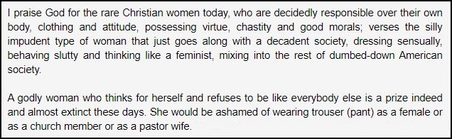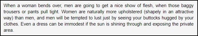 He mentions something about women not wearing sexy blue jeans (are black jeans ok?) and then rambles for an entire paragraph describing, in graphic detail, how women in trousers lure men into sin.