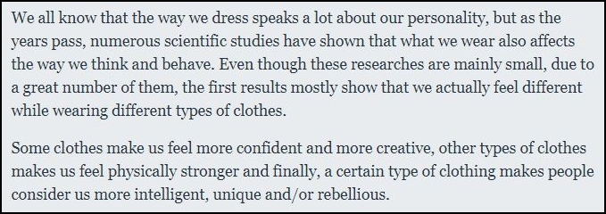 He follows this up with a psychological fact: That what a person wears affects how they think and behave.