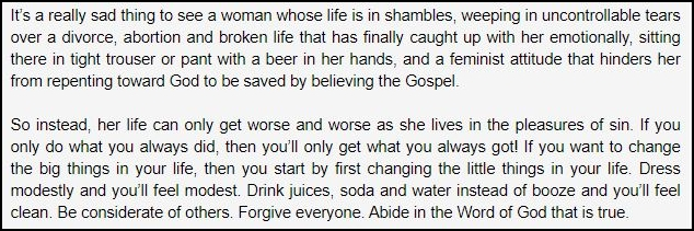 What follows this is an unintentionally hilarious paragraph that heavily implies that any woman who subscribes to feminist ideologies will end up sad, divorced, alone, and grieving the side effects of an abortion gone wrong while wearing tight trousers and drinking beer.