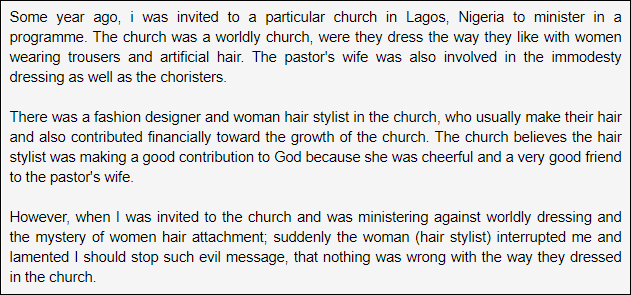 However, to her surprise (and disappointment, I’m sure), the women had changed their mode of dressing, leading her to ask what the hell happened. This was when they informed her that she wasn’t actually invited to preach but to witness what God had done in their lives through her.