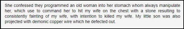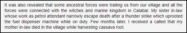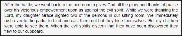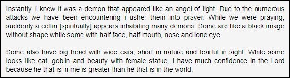 Immediately after the deliverance session, Jonathan claims that the Lord opened their spiritual eyes. This led them to see hundreds of demons lounging around their house. Think Dean Koontz’ “Odd Thomas” but with demons instead of ghosts. Jonathan and his family have demons as their housemates for a month until a severe prayer session renders his (ogboni) landlord crippled one day and dead the next. The demons leave. Jonathan thinks everything is over.