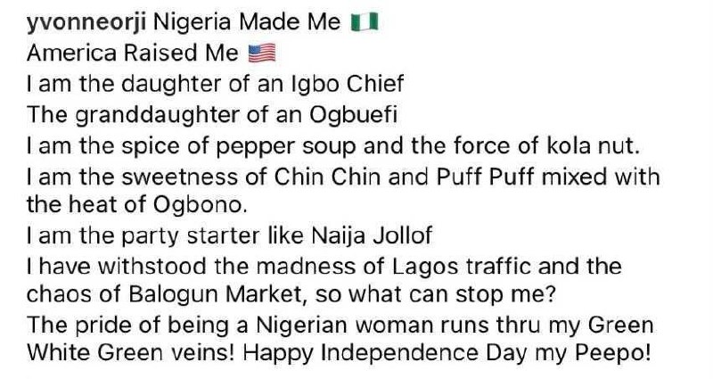 Nigeria celebrated her independence on the 1st of October and Nigerian-American actress Yvonne Orji made this post to celebrate being Nigerian.