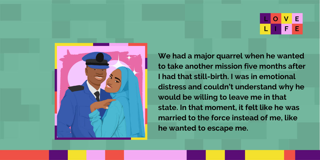 Hajara: We had a major quarrel when he wanted to take another mission five months after I had that stillbirth. I was in emotional distress and couldn’t understand why he would be willing to leave me in that state. At that moment, it felt like he married the force instead of me like he wanted to escape me.
