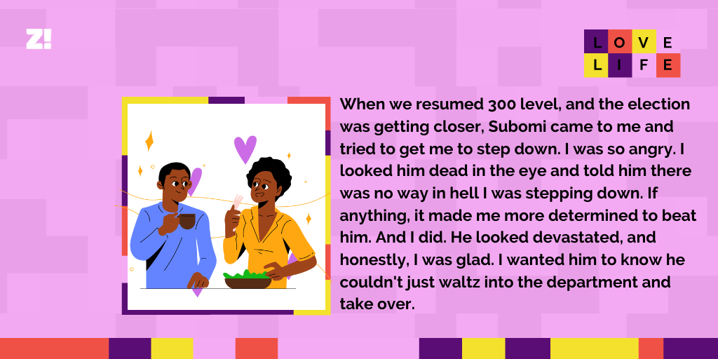 Derinsola: When we resumed 300 level, and the election was getting closer, Shubomi came to me and tried to get me to step down. I was so angry. I looked him dead in the eye and told him there was no way in hell I was stepping down. If anything, it made me more determined to beat him.