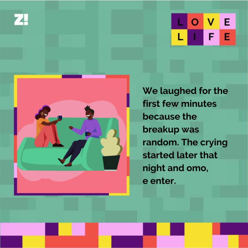 Sarah: We laughed for the first few minutes because the breakup was random. Our friend was so confused. The crying started later that night and omo, e enter.