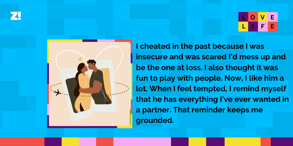 Goodness: I cheated in the past because I was insecure and was scared I’d mess up and be the one at loss. I also thought it was fun to play with people. Now, I like him a lot. When I feel tempted, I remind myself that he has everything I’ve ever wanted in a partner. That reminder keeps me grounded.
