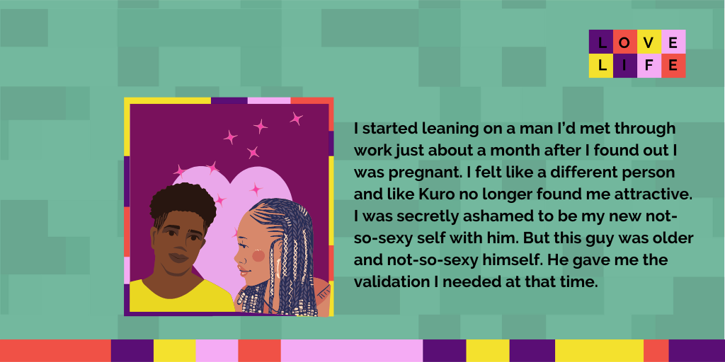 I started leaning on a man I’d met through work just about a month after I found out I was pregnant. I felt like a different person and Kuro no longer found me attractive. I was secretly ashamed to be my new not-so-sexy self with him. But this guy was older and not-so-sexy himself. He gave me the validation I needed at that time.