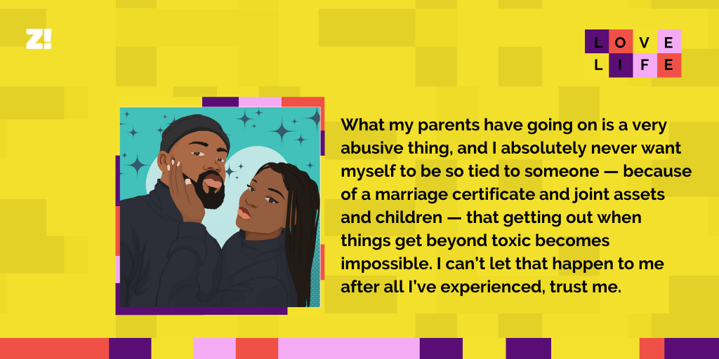 Peju: What my parents have going on is a very abusive thing, and I absolutely never want myself to be so tied to someone — because of a marriage certificate and joint assets and children — that getting out when things get beyond toxic becomes impossible. I can’t let that happen to me after all I’ve experienced, trust me.