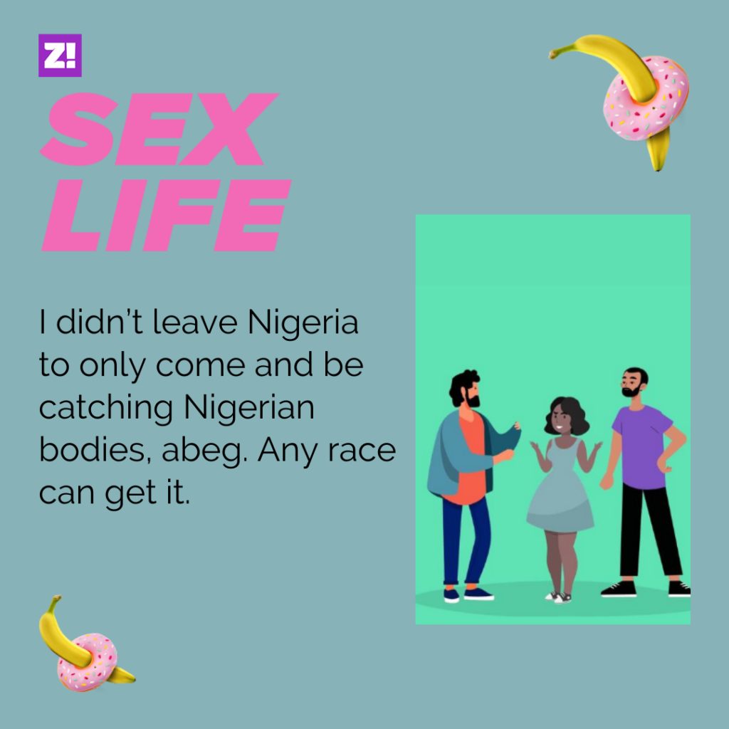 God forbid. I didn’t leave Nigeria to only come and be catching Nigerian bodies, abeg. I’m definitely not opposed to hooking up with men of other races. I’ve had and still get a bunch of offers on social media, but the Nigerian was the best choice at that time.